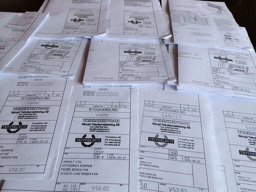 Idag kom det ett tjockt kuvert innehållande en bunt bygghandlingar med posten. Det var detaljritningar från Trivselhus för alla möjliga typer av anslutningar; Golvärmeslingor, avlopp, elschema och ventilation.