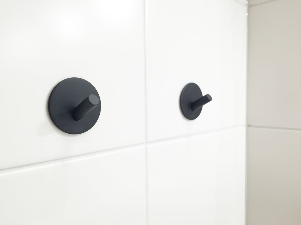 Vi har äntligen hittat snygga krokar och WC-pappershållare som matchar resten av bad/wc-rummen. De kommer från Beslagsboden och går i svart, som även våra handdukstorkar gör.