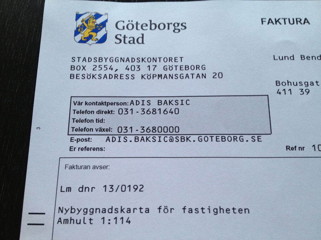 Det damp även ner en faktura med posten från stadsbyggnadskontoret idag. Kostnaden för en nybyggnadskarta för fastigheten hamnade på 6675:-
