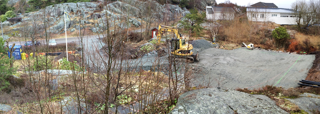 Grunden har plattats till och nu återstår det bara 20cm fyllning med makadam och flis. Sedan ska formen för plattan placeras och därefter är det gjutning som gäller.